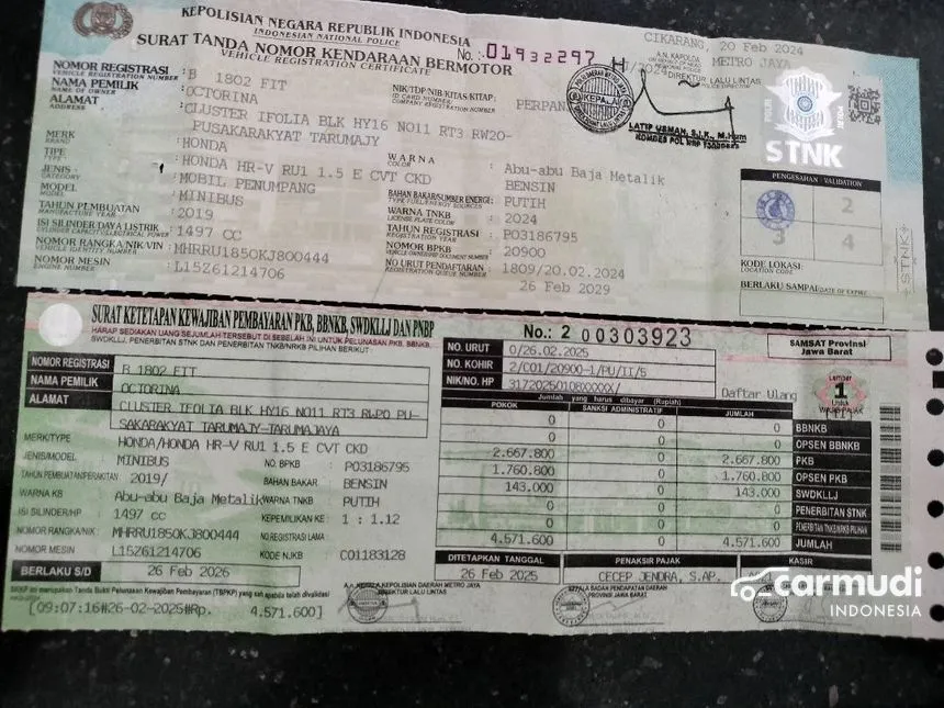 - Nomor Rangka & Nomor Mesin yang sesuai dengan dokumen